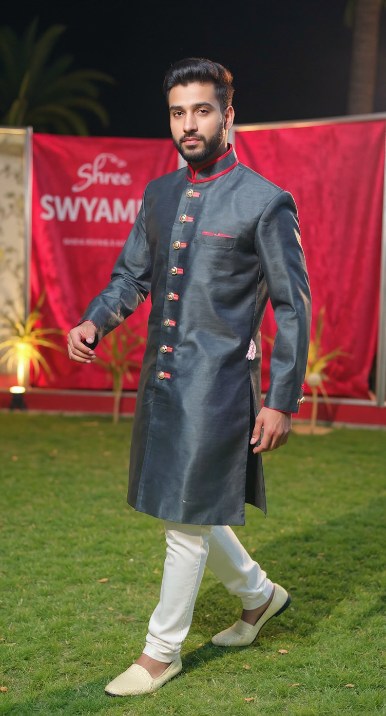 Command attention with this sharp and sophisticated charcoal indoweston, a modern take on a classic silhouette. The suit is crafted from a premium fabric with a subtle sheen, giving it a luxurious feel. The elegant charcoal color is beautifully contrasted by vibrant red trim on the high-neck collar and the front placket. The design is finished with a line of ornate gold buttons and a matching red pocket square, creating a striking and stylish visual. Paired with off-white trousers, this ensemble is the perfect choice for cocktail parties, wedding receptions, and formal evening events. Category: Men's Clothing > Indian & Ethnic Wear > indoweston & Bandhgalas