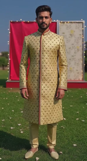 Men's Gold Brocade Sherwani all over hand embroidery with Red Piping